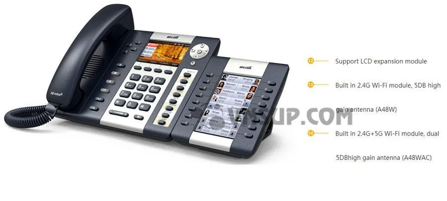 Điện thoại IP Wifi Atcom A48WAC là dòng điện thoại thiết kế dành cho các nhà quản lý và chuyên gia. Dòng điện thoại này được tích hợp màn hình LCD màu 4,3 inch, hỗ trợ Wi-Fi, Gigabit Ethernet cổng kép, tai nghe không dây PoE, EHS.