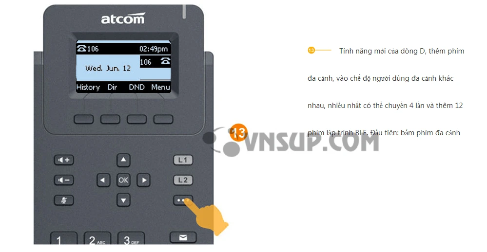Chế độ phím đa cảnh cải tiến của nó. Có thể được sử dụng để mở rộng tối đa 12 phím DSS có thể nhìn thấy. Chắc chắn cải thiện năng suất văn phòng. Nó bổ sung thông tin trợ giúp thân thiện với người dùng vào LCD. Giúp giảm chi phí học tập của người dùng.
