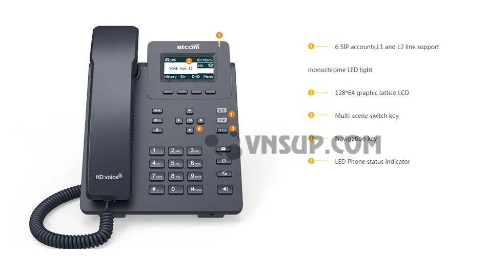 Với 6 tài khoản SIP, 2 dòng khóa và màn hình hiển thị màu xám chiếu hậu toàn màn hình.