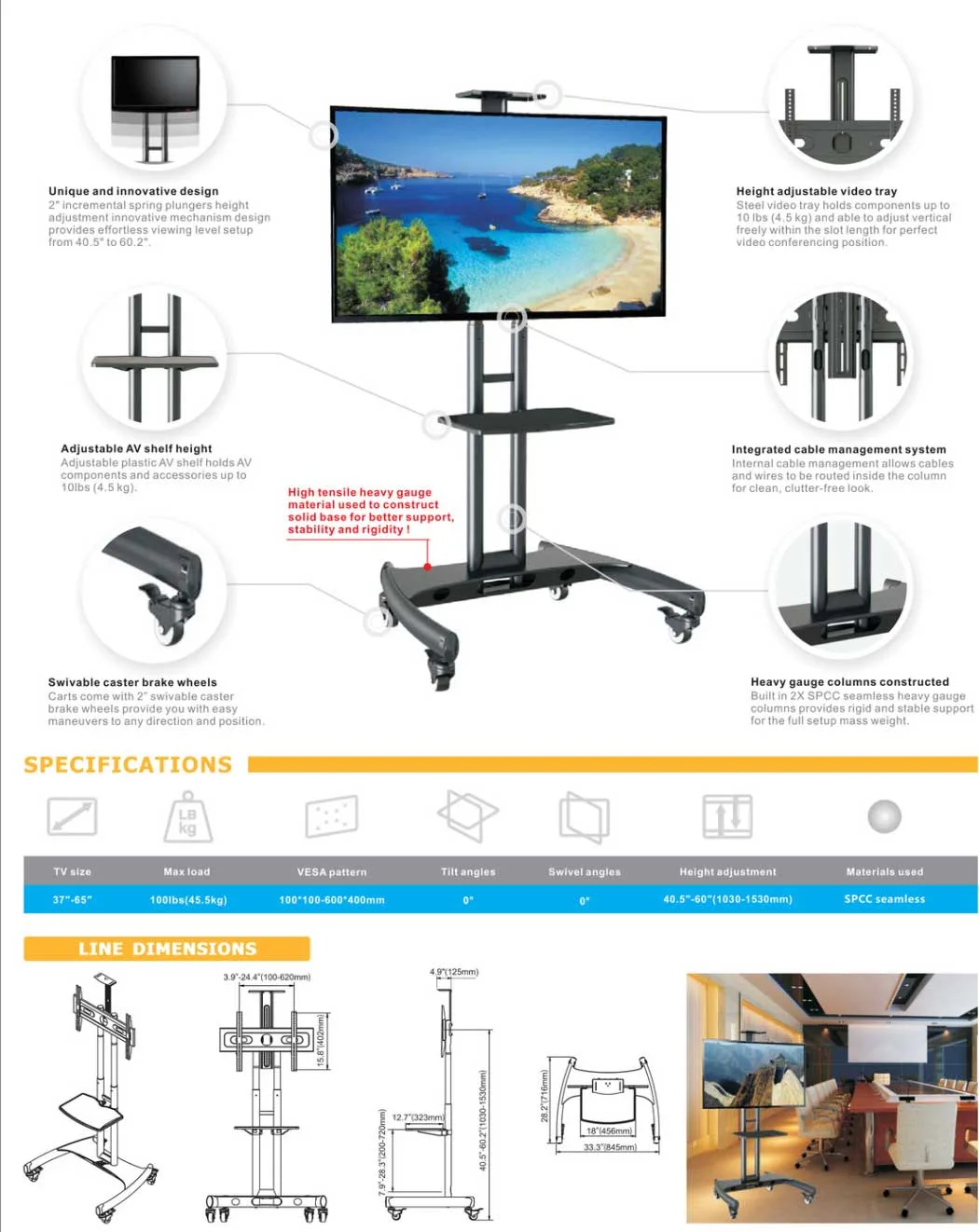 Mặt đứng giá treo tivi này được làm từ sắt SPCC cộng với lớp sơn tĩnh điện bên ngoài tạo nên độ bền và độ chắc chắn. Nó có thể hỗ trợ tải trọng an toàn lên đến 60kg. Đây là loại giá treo lý tưởng cho các phòng trình bày trong các trường học, văn phòng.
