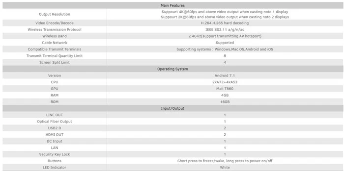 Android 7.1 OS, support 2.4G/5GHz dual frequency wifi, 4K UHD output, 60fps display, 6 CPU, 4GB RAM and 16GB ROM
