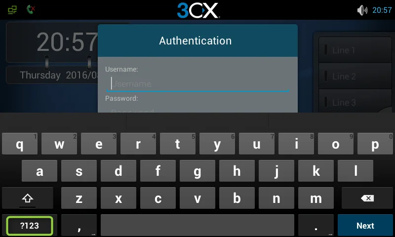 8. Điện thoại sẽ nhắc nhập tên người dùng và xác thực mật khẩu: Nhập số tiện ích mở rộng làm tên người dùng và mã thư thoại làm mật khẩu.