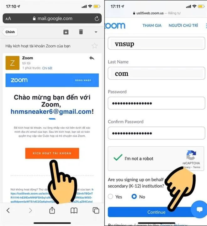 Bước 5: Vào địa chỉ email và nhấn vào thư Zoom vừa gửi đến > Một trang web hiện ra, chọn Kích hoạt tài khoản > Nhập mật khẩu mới 2 lần > Tick chọn mục I’m not a robot > Nhấn Continue.