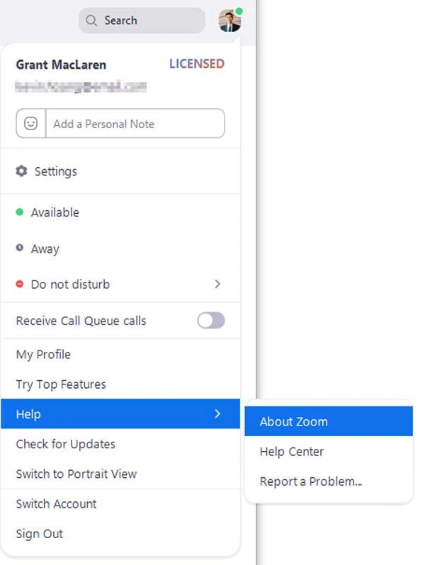 2. Nhấp vào ảnh hồ sơ của bạn sau đó nhấp vào About Zoom.