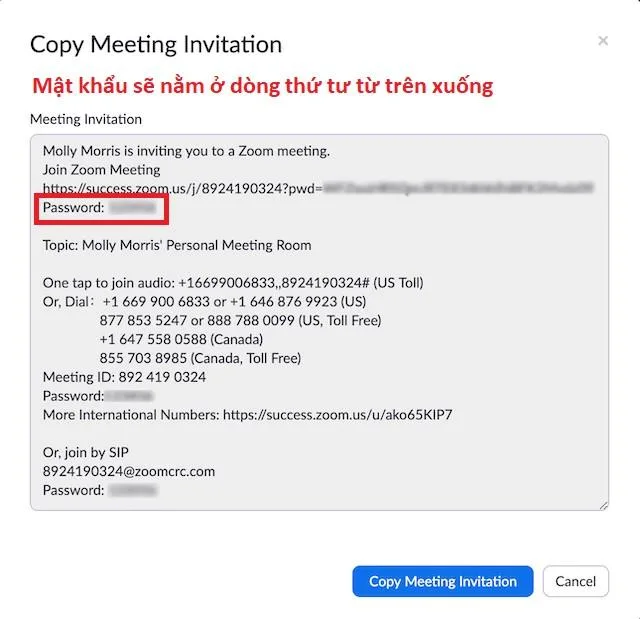 Đối với các cuộc họp được lên lịch từ trước, mật khẩu sẽ ở trong nội dung thư mời, lời mời. Còn với các cuộc họp được tạo mới, mật khẩu sẽ hiện trong Zoom Client hoặc bảng điều khiển Zoom Rooms. Mời tham gia qua địa chỉ web URL cũng sẽ có mật khẩu được gửi kèm.