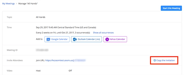 Để gửi lại lời mời, click Copy Invitation trong phần mềm Zoom ở tab Meetings. Bạn cũng có thể Copy the Invitation trong trang chi tiết Meeting ở trang web Zoom. Mục này nằm ở danh sách menu bên trái, click vào Meetings, rồi click vào buổi họp mà bạn muốn mời. Sau đó click Copy the Invitation.