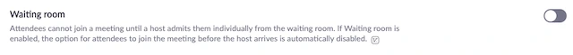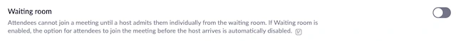 Đồng thời Zoom cũng kích hoạt tính năng Phòng chờ. Tính năng ngày cho phép chủ tọa (host) kiểm soát những người tham gia vào cuộc họp. Phòng chờ là một trong những cách tốt nhất để kiểm soát ai là người tham gia cuộc họp hoặc buổi học của bạn bằng cách cho bạn một tùy chọn cho phép từng người từng người vào cuộc họp hoặc cho phép hết các thành viên đang ở phòng chờ tham gia vào cuộc họp cùng một lúc. Chúng tôi khuyến cáo bạn nên sử dụng tính năng này để cuộc họp của bạn được an toàn, bảo mật trước những người tham gia không mong muốn nếu số phòng hoặc lời mời họp bị khách mời vô tình làm lộ ra cho những người không liên quan. Tính năng này là một tùy chọn và bạn hoàn toàn có thể tắt, vô hiệu hóa chúng trong cài đặt.