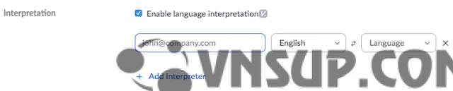 6. Nhập email Zoom của thông dịch viên. Ngôn ngữ mà bạn chọn cho thông dịch viên sẽ trở thành kênh âm thanh cho ngôn ngữ mà thông dịch viên đó sẽ dịch.