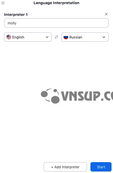 2. Bạn có thể thêm hoặc xóa thông dịch viên bằng nút Add Interpreter này. Sau đó click Start để thông dịch viên bắt đầu dịch cho cuộc họp của bạn.