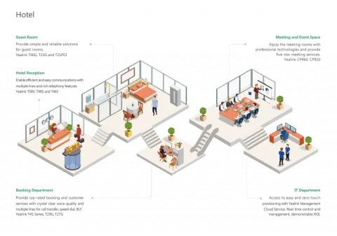 Giải pháp điện thoại tối ưu nhất cho khách sạn. Tiết kiệm chi phí các cuộc gọi, quản lí dể dàng book phòng của khách hàng. Yealink cung cấp nhiều mẫu mã cho nhiều phân khúc và hướng tới mọi đối tượng người dùng như dùng cho lễ tân, phòng khách, phòng ngủ, phòng tắm…