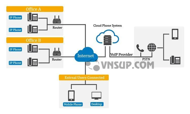 Nói một cách đơn giản, với hệ thống điện thoại doanh nghiệp được lưu trữ trên đám mây. Bạn thực hiện và nhận cuộc gọi bằng điện thoại IP, điện thoại di động hoặc các thiết bị khác. Và lưu lượng thoại được truyền qua kết nối Internet được kết nối với các trung tâm dữ liệu ngồi trong đám mây.