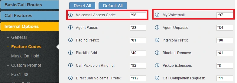 Để truy cập voicemail thì cần có mã truy cập, mã này thay đổi tại: PBX -> Internal Option -> Feature Codes như hình dưới: