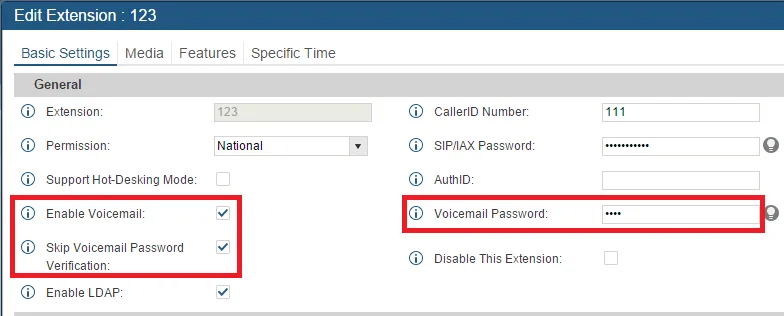 Ví dụ máy lẻ 123 ta thiết lập voicemail