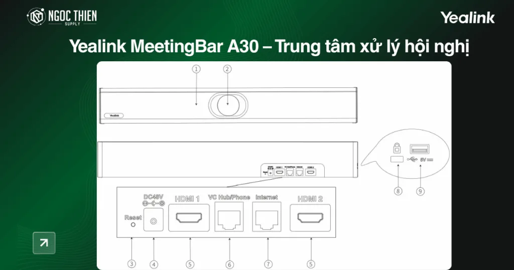 Yealink MeetingBar A30 được thiết kế với bố cục cổng kết nối rõ ràng, giúp người dùng dễ dàng lắp đặt và vận hành. Mỗi thành phần trên thiết bị đều đảm nhận một chức năng riêng, đảm bảo hệ thống hoạt động ổn định, kết nối linh hoạt và đáp ứng tối đa nhu cầu sử dụng trong môi trường họp chuyên nghiệp.