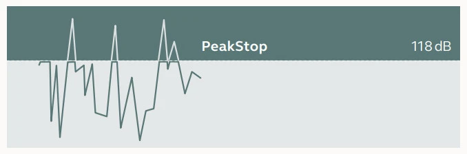 Nhờ vào một cổng điện tử hoặc bóng bán dẫn cảm nhận “nhanh như chớp”, PeakStop luôn tích cực bảo vệ người dùng bằng cách giữ mức âm thanh tuyệt đối và năng lượng âm thanh cao nhất trong vùng an toàn. Nhờ đó có thể ngăn ngừa các âm thanh có hại cho tai.