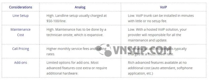 Dưới đây là tổng quan về so sánh chi phí giữa VoIP và Hệ thống điện thoại analog.