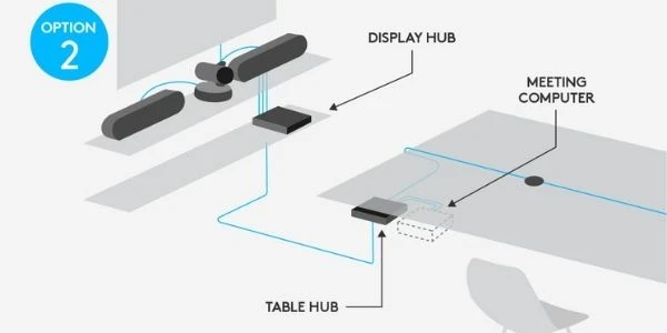 Với Hub Màn hình và Hub trên bàn được kết nối thông minh qua dây CAT6A; giúp phân bổ thiết bị dễ dàng theo bố trí phòng sử dụng. Trên Hub ở bàn được tích hợp đầu cắm HDMI giúp hạn chế việc phải kéo dây lằng nhằng trong phòng.