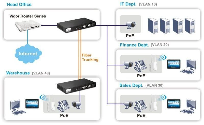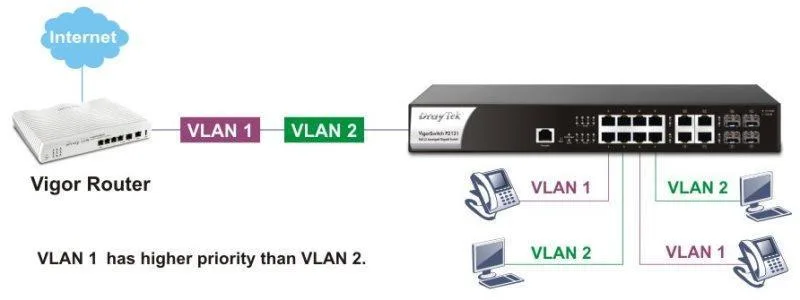 VigorSwitch P2121 có thể có VLAN dựa trên các thẻ 802.1q, giao thức và địa chỉ MAC. Nó cũng cung cấp Voice VLAN và Surveillance VLAN để xác định lưu lượng truy cập từ điện thoại IP hoặc camera IP tự động mà không cần chỉ định từng địa chỉ MAC của chúng. Và nó có khả năng GVRP.